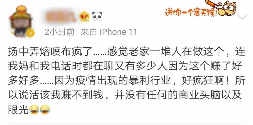 一個揚(yáng)中的網(wǎng)友在微博上說:揚(yáng)中弄熔噴布瘋了.....感覺老家一堆人在做這個,連我媽和我電話時都在聊又有多少人因為這個賺了好多好多......