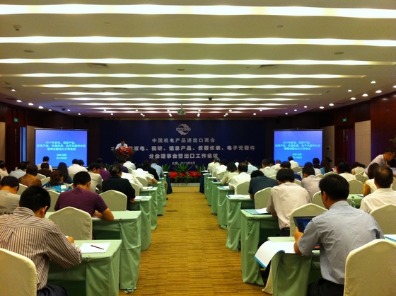 8月24日,由中國(guó)機(jī)電產(chǎn)品進(jìn)出口商會(huì)主辦的“2011年家電、視聽、信息產(chǎn)品、儀器儀表、電子元器件分會(huì)理事會(huì)暨出口工作會(huì)議”在合肥天鵝湖大酒店舉行。作為機(jī)電商會(huì)視聽分會(huì)的理事單位,安糧國(guó)際總經(jīng)理助理吳國(guó)杰等人參加了會(huì)議。