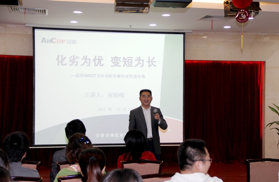 10月21日下午,公司辦公室在五樓多功能廳組織舉辦《化劣為優(yōu),變短為長——試用SWOT方法淺析安糧實業(yè)貿(mào)易環(huán)境》專題講座。本次講座由安糧實業(yè)總經(jīng)理助理祝曉峰(內(nèi)訓師)主講。安糧實業(yè)貿(mào)易業(yè)務部門和公司系統(tǒng)相關業(yè)務部門、職能部室共計50多人參加了講座。