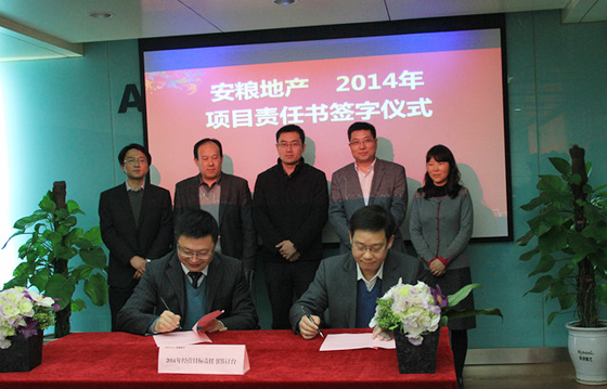 會(huì)議還聽(tīng)取了各部室和各項(xiàng)目公司年度工作總結(jié)和計(jì)劃匯報(bào),并在所有與會(huì)人員的見(jiàn)證下,臨沂、蕭縣、安福、東怡、和縣、銅陵、徐聞7個(gè)項(xiàng)目公司負(fù)責(zé)人與總經(jīng)理汪勇簽署了2014年經(jīng)營(yíng)目標(biāo)責(zé)任狀。