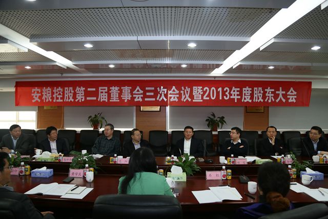 4月13日,公司召開安糧控股第二屆董事會第三次會議暨2013年度股東大會。公司董事會成員包祥華、桂冠、李錦鐸、方宗友、曹訓(xùn)立、宋恩君參加會議。監(jiān)事會成員陳素萍、黃學(xué)良、石紅及經(jīng)營層成員儲潔印、潘冬生、張來往列席會議。國貿(mào)集團范陽董事長應(yīng)邀出席會議。會議由董事長主持。