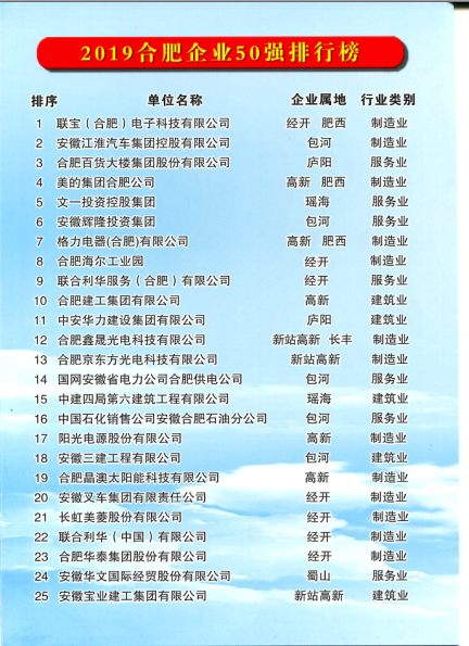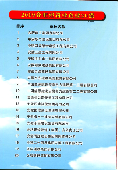 合肥建工榮膺2019合肥企業(yè)50強(qiáng) 首登合肥建筑業(yè)企業(yè)20強(qiáng)榜首