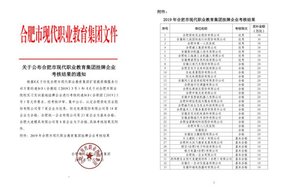 11月26日,合肥市現(xiàn)代職業(yè)教育集團掛牌企業(yè)考核結(jié)果揭曉,合肥建工在56家掛牌企業(yè)考核中取得第四名的好成績,考核等級被評為優(yōu)秀的七家企業(yè)之一。這是合肥建工開展校企合作以來,首次考核等級被評為優(yōu)秀,并獲得合肥市政府專項資金獎補。