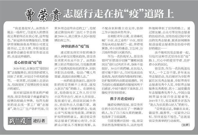 黃山人曾榮貴是安徽伊思頓糧油食品有限公司黨支部書(shū)記,他是一名傷殘退伍軍人,擔(dān)任阜陽(yáng)益愛(ài)志愿者協(xié)會(huì)副會(huì)長(zhǎng),曾積極參與過(guò)大小百余次公益活動(dòng),被評(píng)選為“助人為樂(lè)黃山好人”稱號(hào)。在今年新冠病毒蔓延的特殊時(shí)期,曾榮貴不僅捐資戰(zhàn)“疫”,更沖鋒在前。正月初一,他就協(xié)同當(dāng)?shù)卮鍍晌e極投入到防控疫情一線,白天走進(jìn)村委會(huì)和公共場(chǎng)所開(kāi)展防疫消毒,幫助村兩委工作人員開(kāi)展出入人員管控;晚上編輯公眾號(hào)文章,宣傳防疫活動(dòng)和防疫過(guò)程中的好做法,用行動(dòng)踐行了共產(chǎn)黨員的初心使命,發(fā)揮了黨員的先鋒模范作用。