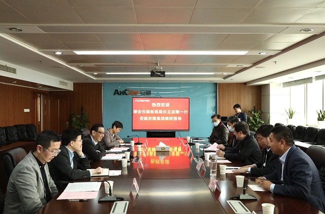 周洪副總裁對(duì)王局長(zhǎng)一行的到來(lái)表示歡迎,并介紹了公司的發(fā)展歷程、業(yè)務(wù)板塊及2020年經(jīng)營(yíng)情況。王局長(zhǎng)簡(jiǎn)要介紹了泰安市發(fā)展情況以及當(dāng)?shù)靥厣a(chǎn)品,提出希望發(fā)揮雙方平臺(tái)優(yōu)勢(shì),拓寬與安糧集團(tuán)的合作空間。雙方與會(huì)人員就農(nóng)產(chǎn)品研發(fā)、產(chǎn)業(yè)化建設(shè)及推動(dòng)當(dāng)?shù)赝庀蛐徒?jīng)濟(jì)發(fā)展等方面展開(kāi)了深入的交流討論。