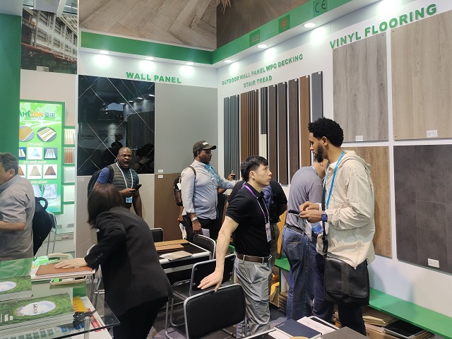建材展位重點推出了墻板,格柵,樓梯踏板以及木塑戶外地板等新產品,從室內到戶外產品一應俱全。參展部門根據(jù)對去年秋季交易會的考察分析以及近期客戶最新詢盤情況的整合梳理,積極開拓更新參展產品。結合國外最新流行的趨勢,推出了拼花木紋,石紋等當下十分暢銷的花色。利用立體燈箱,將產品優(yōu)勢,產品結構剖面等信息直觀展示,讓客戶更加清晰地了解產品的性能和優(yōu)點,吸引諸多專業(yè)買家的觀看和洽談。此外,在攤位新增產品拼裝的體驗區(qū),增加產品小樣及配件的DIY拼裝,吸引客戶自己動手,大大提升了參與度和體驗感,讓客戶真切地感受到安糧的誠意與新意。
