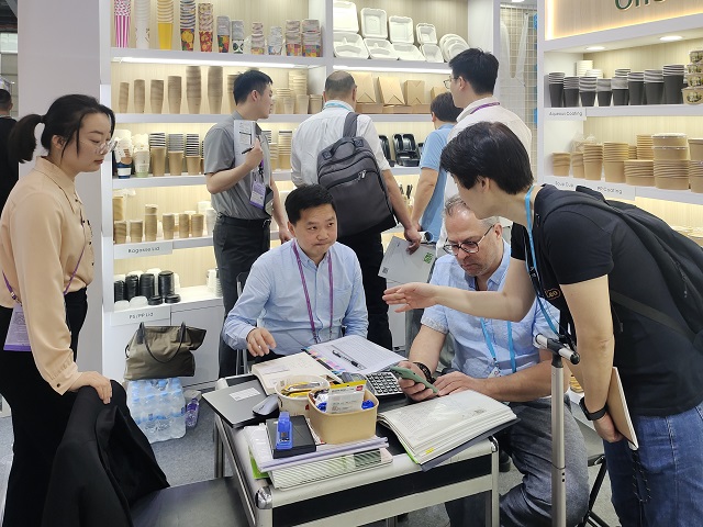 安糧家居展位由安糧國際日用品事業(yè)部攜數(shù)百款單品展出,產品幾乎覆蓋一次性餐廚全套系列。本次展會重點推出了全新的PHA高端系列以及壽司盒、紙盤、甘蔗漿吸管、超細纖維抹布等新品,在館內格外醒目、深受青睞。此外,部門順應綠色環(huán)保趨勢,推出了一系列最新環(huán)保產品,吸引了不少具有環(huán)保意識的客戶群體關注。攤位模擬國外超市擺放,仿造小型超市。擺放的產品統(tǒng)一設計包裝,著眼聚焦“產品系列化+全流程服務”,為全球采購商提供便利的“一站式采購服務”,獲得新老客戶的一致認可與好評。