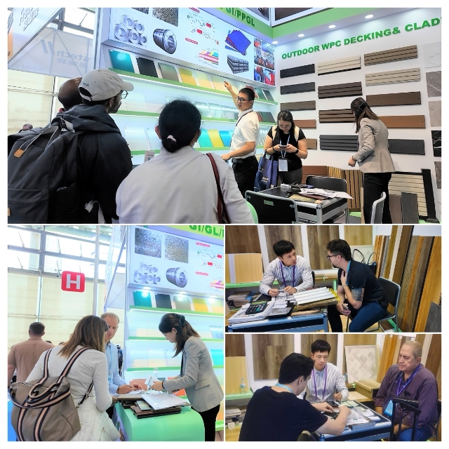 在建材展區(qū),同樣亮點(diǎn)紛呈。安糧以“適配性”和“實(shí)用性”贏得客戶認(rèn)可。展區(qū)重點(diǎn)展示的室內(nèi)地板、墻板及格柵等產(chǎn)品,可實(shí)現(xiàn)“墻地一體化”裝修,為客戶提供高效、整體的空間解決方案。其中,UV亮面墻板因安裝便捷省時(shí)的特點(diǎn),成為現(xiàn)場咨詢量最高的產(chǎn)品之一。值得關(guān)注的是,“波浪瓦” 作為本次展出的核心亮點(diǎn)產(chǎn)品,憑借其卓越的防水與排水性能、隔熱與保溫、防火阻燃等特性,吸引了來自南美和非洲區(qū)域的多位客戶,目前已與阿根廷、津巴布韋和幾內(nèi)亞等國客戶達(dá)成初步合作意向。